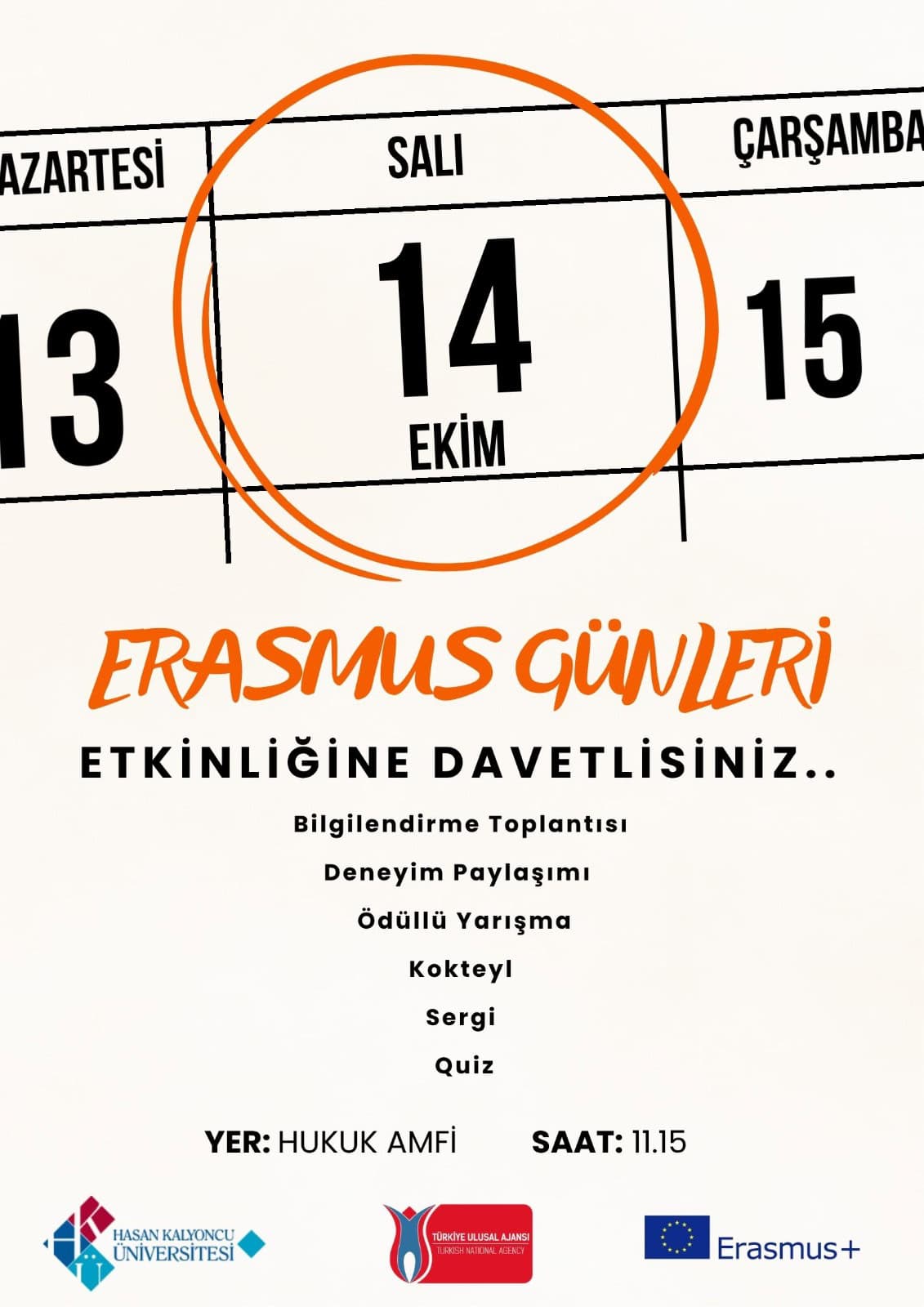 Hasan Kalyoncu Üniversitesi olarak, Erasmus+ programını tanıtmak ve öğrencilerimizi yurt dışı eğitim olanakları hakkında bilgilendirmek amacıyla 14 Ekim Salı günü saat 11.15’te Hukuk Amfisi’nde “Erasmus Günleri” etkinliğimizi gerçekleştiriyoruz.
